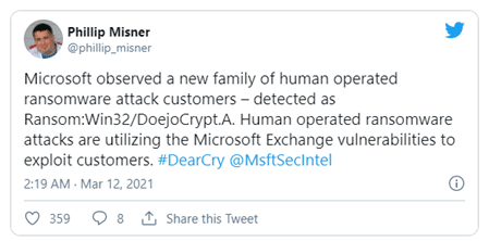 Some days after, Philip Misner, a researcher from Microsoft, confirmed on Twitter that the DearCry was installed in human-operated attacks using the recent Microsoft Exchange exploits.
