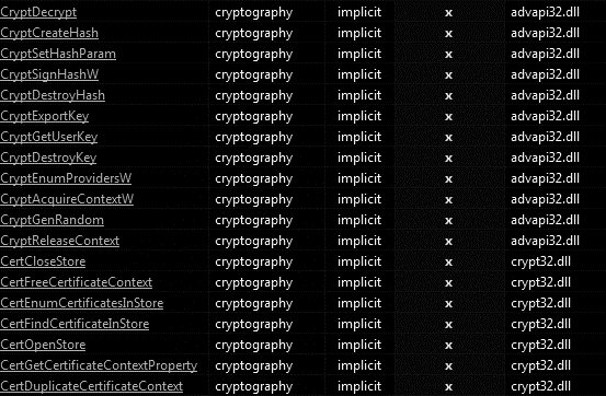 By analyzing the import address table (IAT) of the binary file, we can observe that many cryptographic calls from advapi32.dll and crypt32.dll DLLs are present on the ransomware file, a clear sign we are facing a ransomware threat.