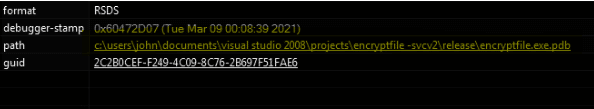Another interesting artifact found is the path of the PDB file present inside the binary, which shows the string “svc,” a common acronym often used for designating the term service. And also “john,” probably the computer name where the binary was compiled by the malware author.