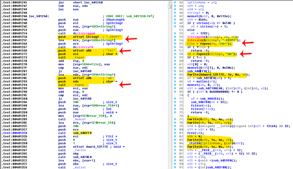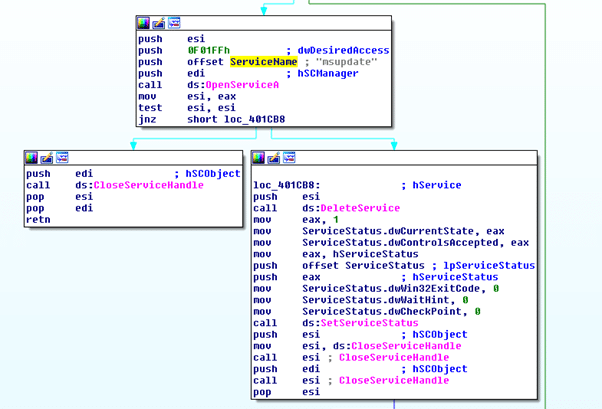 The first time DearCry is started, a new Windows service is created with the name “msupdate.” This service is then responsible for the encryption process and removed later when the encryption process is terminated. Figure 5 below shows some details about this service, namely (i) OpenServiceA, and (ii) DeleteService Windows calls.