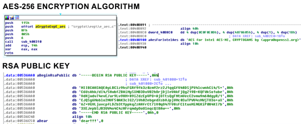 Figure 7: AES-256 encryption algorithm and RSA public key both hardcoded inside the DearCry binary file.