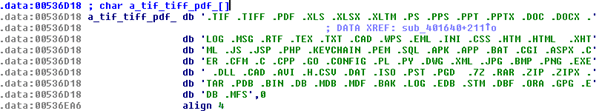 Figure 8: DearCry target file’s extensions hardcoded inside the binary.