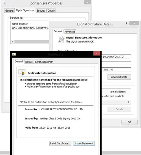 The investigation conducted by the experts at Kaspersky revealed that the threat actors behind Duqu 2.0 used valid certificate from Hon Hai Precision Industry Co. LTD (aka Foxconn Technology Group) to digitally sign the malicious code. Foxconn provides electronic components for a wide number of companies, including Apple and BlackBerry.