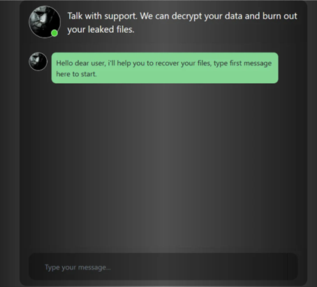 Finally, the criminals are waiting for a contact from the victim’s side in a chat available over the TOR network. This is a normal behavior used for recent ransomware groups such as Ragnar Locker.