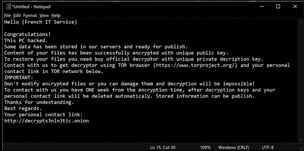 First, HelloKitty searches for files inside the system folder tree and then encrypts all the files adding a new extension: .crypted. Also, a ransom note file dubbed “read_me_lkdtt.txt” file is dropped into every folder it accesses.