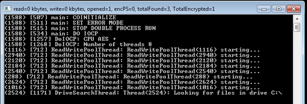 Curiously, the ransomware opens a shell terminal exhibiting the output while it is executed. This is not a common behavior observed in many pieces of ransomware, but that can help to identify samples of this particular family of threats.