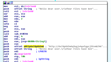 The malware uses crypto calls from ADVAPI32.dll to encrypt the victims’ files and also deletes all the files available in the trash (SHEmptyRecycleBinA).