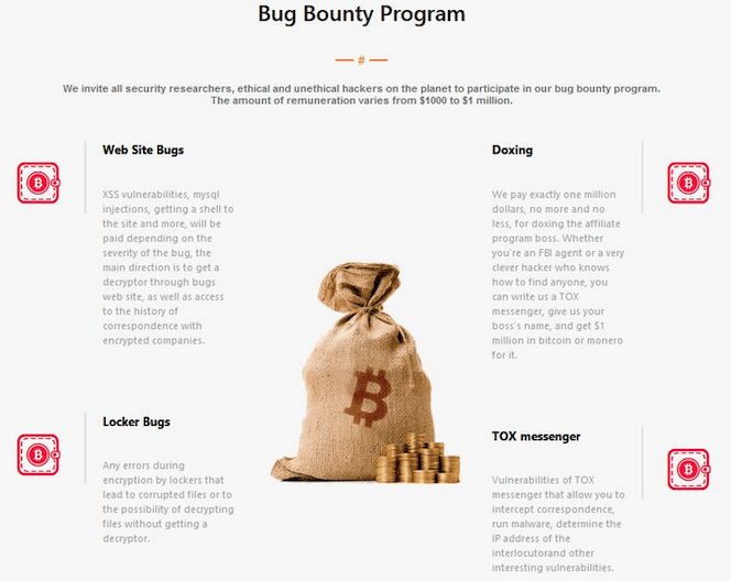 - Website bugs: XSS vulnerabilities, MySQL injections, getting a shell to the site and more will be paid depending on the bug's severity. The main direction is to get a decryptor through the bug’s website and access the history of correspondence with encrypted companies.