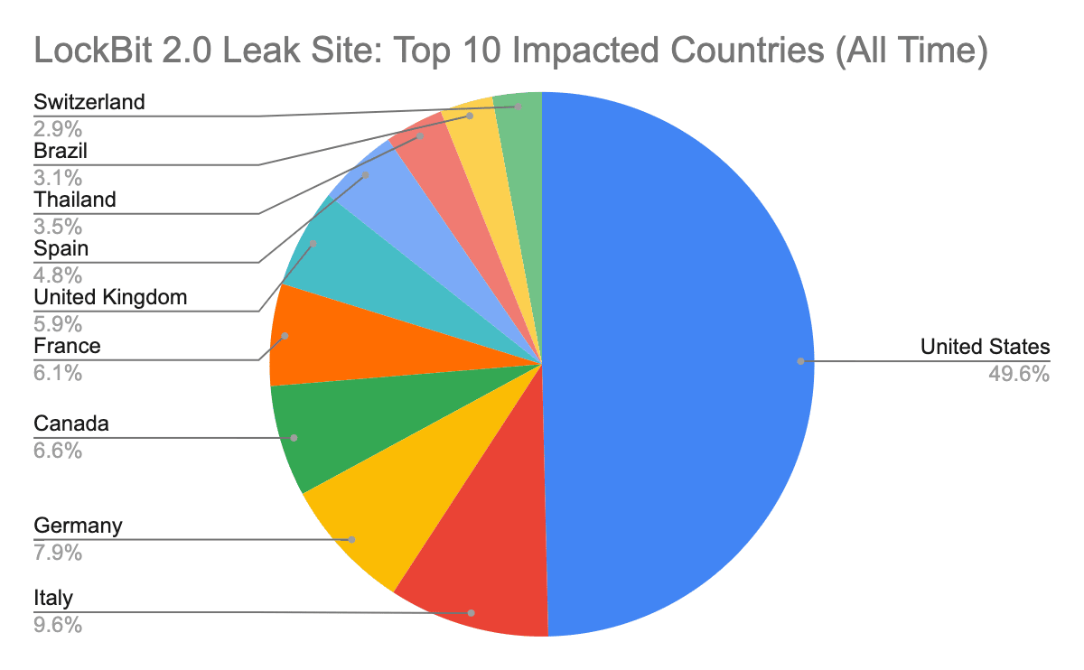 Figure 2: Top 10 impacted countries by LockBit 2.0 (source).