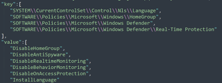 key: registry paths with processes to disable (firewall, shadow copies and so on).