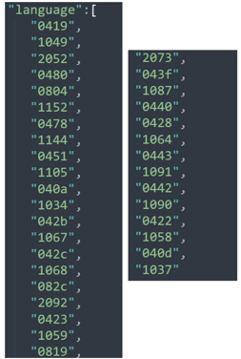 Figure 11: Allowlisted language codes contained inside the ransomware config. If any language matches, the ransomware terminates its execution.