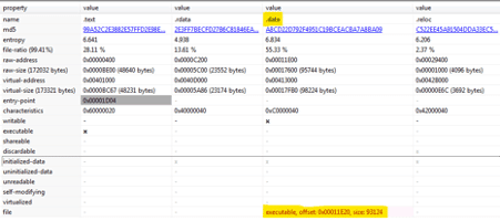From the analysis of the binary file, we can observe that inside the .data section, there is a hardcoded PE file in the offset 0x00011E20 with the size 93124. This detail reveals that a 2nd file, a DLL, will be injected into the memory, decrypted and the execution flow transferred to it.