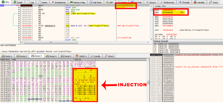 After executing the loader, the binary loads the DLL from the .data section into the memory using the HeapAlloc() call. Next, parts of the string are deobfuscated using a bitwise NOT operation, and the code is injected with the VirtualAlloc() as presented in Figure 2.