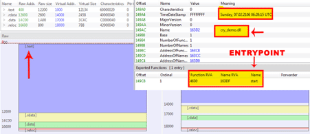 The new DLL (Ragnarok ransomware) has the original name “cry_demo.dll.” It was built with a nonsense timestamp and exports only a function: “start.” This is its entry point to start the infection chain.