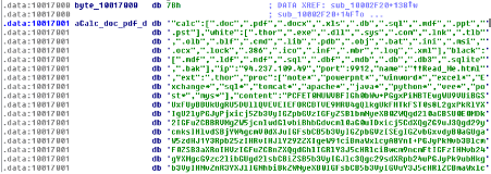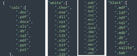 calc, white and black: target files’ extensions to encrypt and extensions to bypass during the encryption process.
