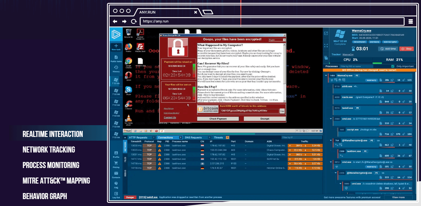 Any.Run is a tool that allows users to play with malware in a secure environment. This interactive tool provides dynamic analysis and static analysis on Windows machines. It parses the events happening during the execution of one or more processes. The free community version is powerful, with many resources that either users or cyber experts can use.