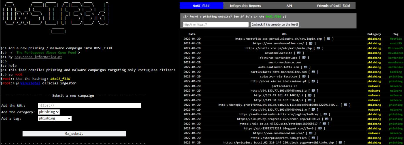 0xSI_f33d is a repository that compiles phishing and malware campaigns targeting internet end users. 0xSI_f33d aggregates phishing and malware campaigns, and as a result, an API for community integration is provided. This API can be integrated into several systems, including SIEMs, firewalls and so on. The tool also has a feature to search for specific URLs and domains and learn if the submitted artifact is then categorized as malicious.