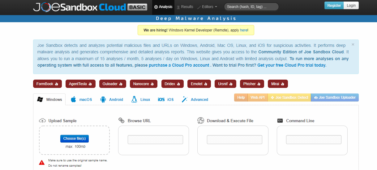 Joe Sandbox is an online sandbox that detects and analyzes potential malicious files and URLs on Windows, Android, Mac OS, Linux and iOS for suspicious activities. This tool performs deep malware analysis and generates detailed reports in several formats. It provides a community version with many powerful features that help cyber experts and users with threat analysis.