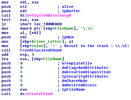 It starts off by getting a handle on the logical drive on which Windows is installed.