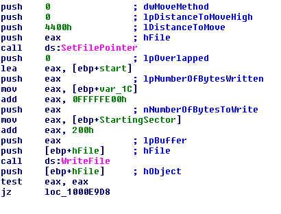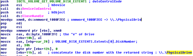 Then it sends an I/O request to the target volume to get the disk number. The result is the physical drive that contains the Windows installation e.g: .PhysicalDrive0. This will be used to open a handle to the drive, as you can see in the next figure, and write to its sectors.