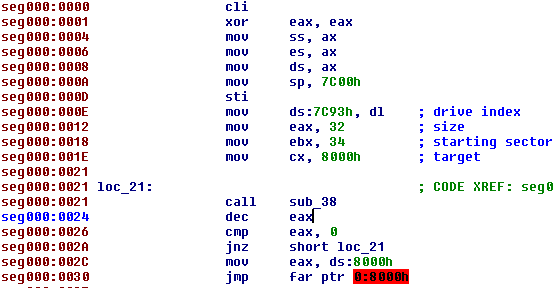 What the bootloader does (in sub_38) is read 32 sectors from the disk starting from sector 34 into the address 0x8000 then jumps to the code there.