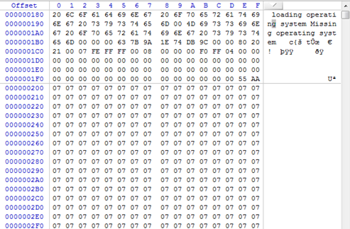 Next, we enter a loop where each sector, starting with the second one, of course, is read into a memory buffer, XORed with 0x07 and then written back to the physical drive. The loop stops at the 34th sector.