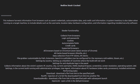Figure 3 below shows the features of Redline shared by criminals in a specific forum where it is distributed in the wild by its authors.