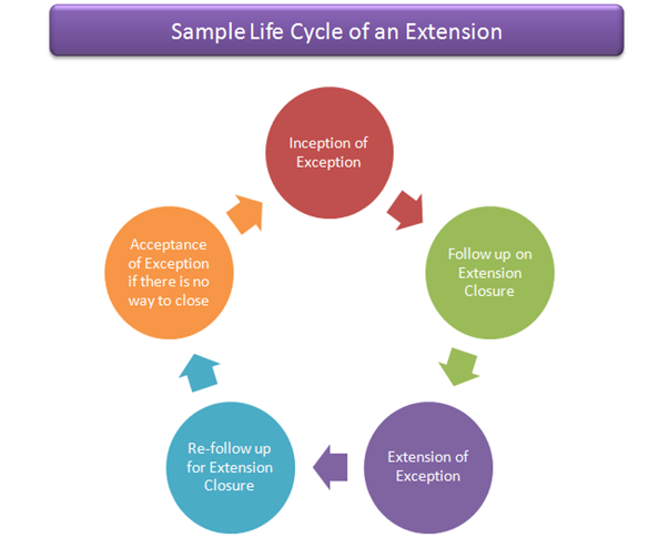 The following picture demonstrates the sample life cycle of an extension. It should be noted that there can be more iterations than demonstrated in the picture. Some exceptions could have been closed in single iteration, while others may take multiple cycles for closure. Depending on the deadline associated, the number of iterations may vary from exception to exception.