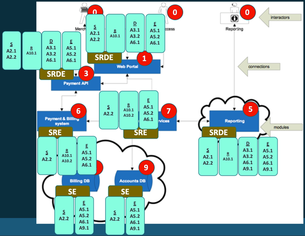 The image above shows the various flows within the threat diagram, labeled with the corresponding OWASP vulnerabilities. The labels in the brown boxes are the STRIDE labels, while the green boxes refer to specific OWASP mitigations outlined above.