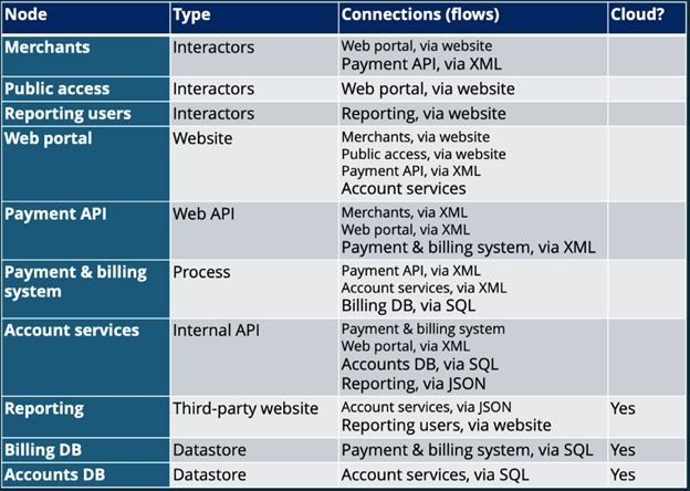 Nodes within the threat diagram can be impacted by Spoofing, Repudiation, Denial of Service and Elevation of Privilege.
