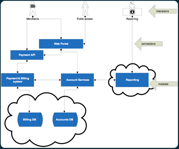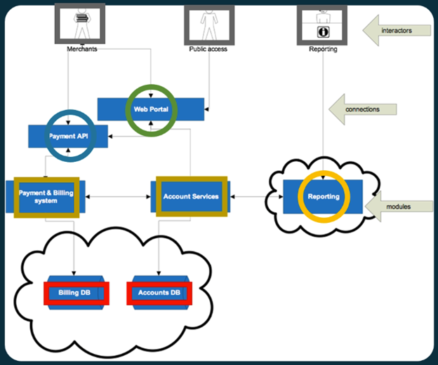 - Connections: Connections are links between interactors and modules. This includes interactor-module flows (like the use of a web portal) and module-module flows (such as an application querying a database).