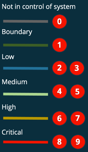 The image above shows the two different ways in which the threat model should be labeled. It includes a general scale of criticality (from “not in control of system” to critical) and a more specific 0-9 scale of criticality.