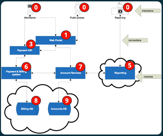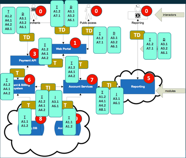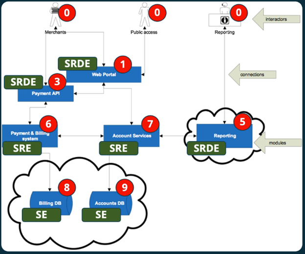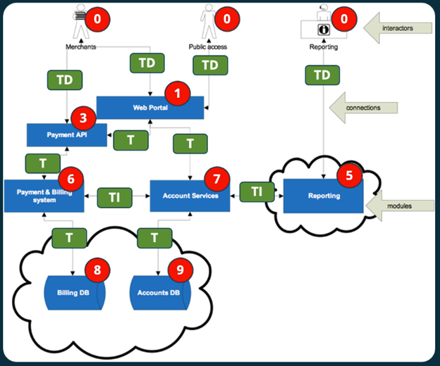 The first step in this stage of the process is labeling the diagram based upon criticality, as shown in the image above. As shown above, these various nodes are labeled based on the criticality of the data and functionality that they embody. For example, the organization’s databases are “critical” because they store sensitive information commonly protected by data privacy laws. At the other extreme, the interactors within the system are labeled at the lowest level of sensitivity: “not in control of the system”.