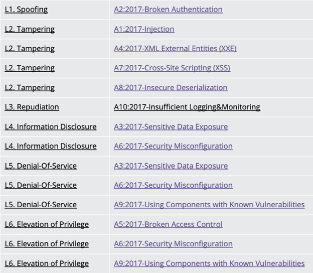 The table above shows the OWASP vulnerabilities that map to each of the six threats outlined in the STRIDE threat model. As shown, some threats have multiple different OWASP vulnerabilities, while others have only one.