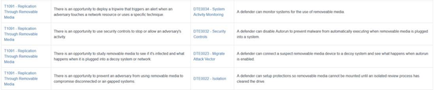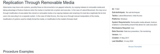 Once we have clicked on this option, we then are shown a list of possible concepts where we can see attack vectors, and potential defensive actions. We can click on one of these on the left to dive into the method further, such as (in our case) T1091 - Replication through Removable Media.