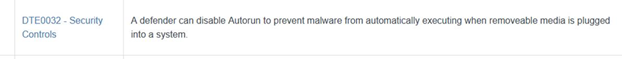 After we review the attack methods, we will want to return to the Mapping to check out possible defensive actions for us to take. We can see that one of the recommendations for this type of possible attack is disabling Autorun — a quick and effective method to continue to have access to storage for the time being, but still block possible malicious attacks from running automatically. However, this may not be the solution all that we need for our environment. We do see, though, that this is a description from DTE0032 - Security Controls.