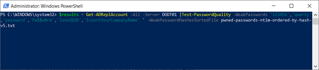 #>There are many interesting variations that you can test with DSInternals. For example: if, in addition to the HaveIBeenPwned database, you want to use a customized list of weak passwords such as 123456, qwerty, password, Pa$$w0rd, June2020, or your company name, just use the following syntax: