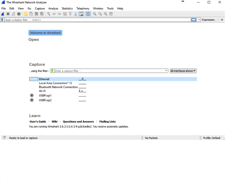 The very first step for us is to open Wireshark and tell it which interface to start monitoring. In our case this will be Ethernet, as we’re currently plugged into the network via an Ethernet cab.