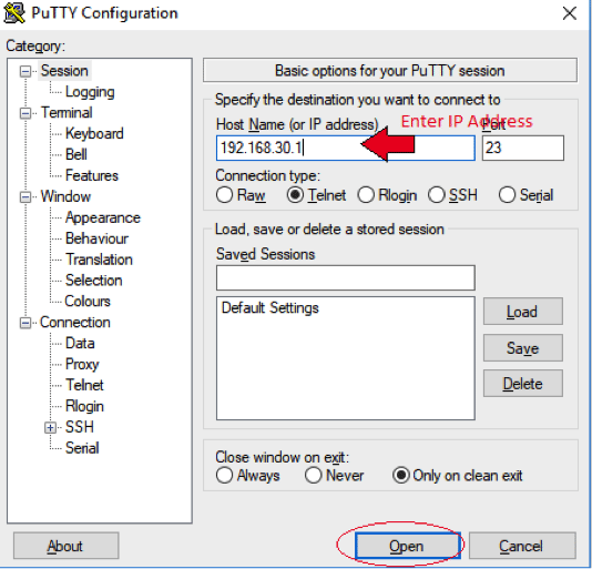In this instance, we know that the IP address of the Cisco is 192.168.30.1, so we enter it into Putty like so: