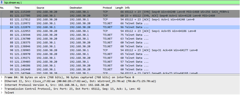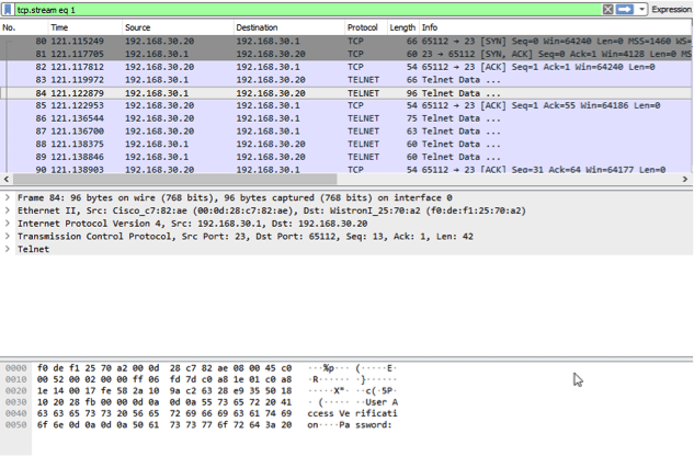 This is a pretty good example of what you can find when passwords are being transmitted in plain text, which is why Telnet is no longer as popular as it used to be. It is best practice to use methods that encrypt traffic between you and the appliance that you are administering whenever possible.
