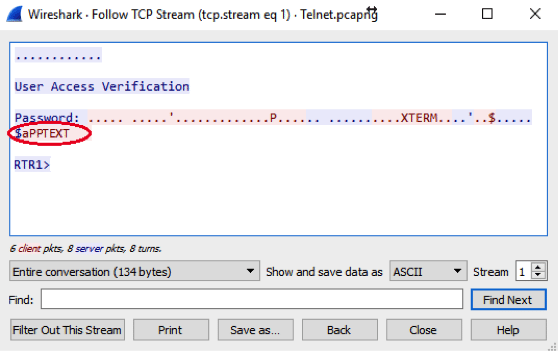See the part that says “User Access Verification Password:”? That’s the plain text from the login prompt in our earlier step that we saw in Telnet. Let’s investigate further.