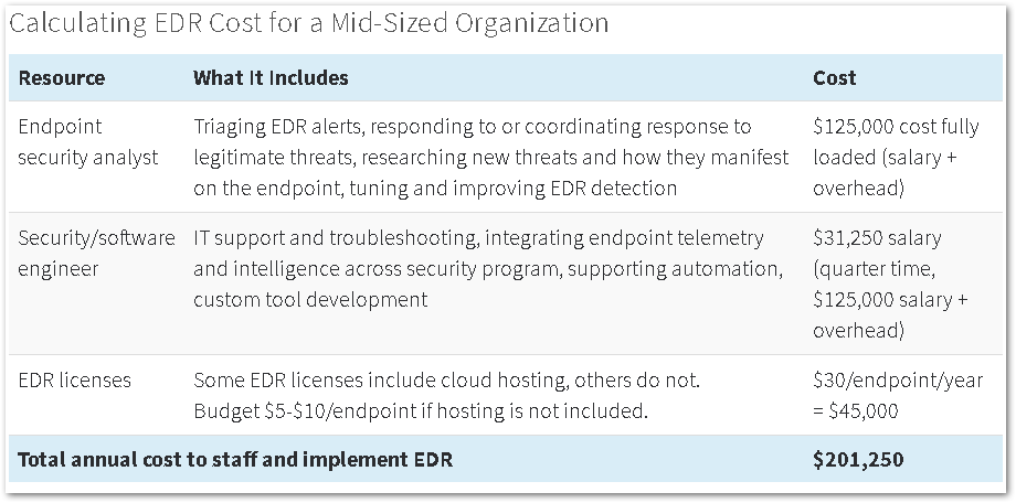 Red Canary has taken a stab at calculating the cost of implementing EDR (Endpoint Detection and Response) at a mid-sized company.
