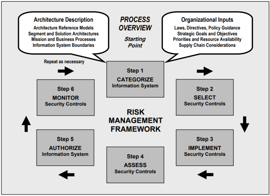 With all of these aspects in mind, the RMF was designed by NIST to be a cyclical process. It consists of six individual steps, outputs from one phase serve as inputs to the next.
