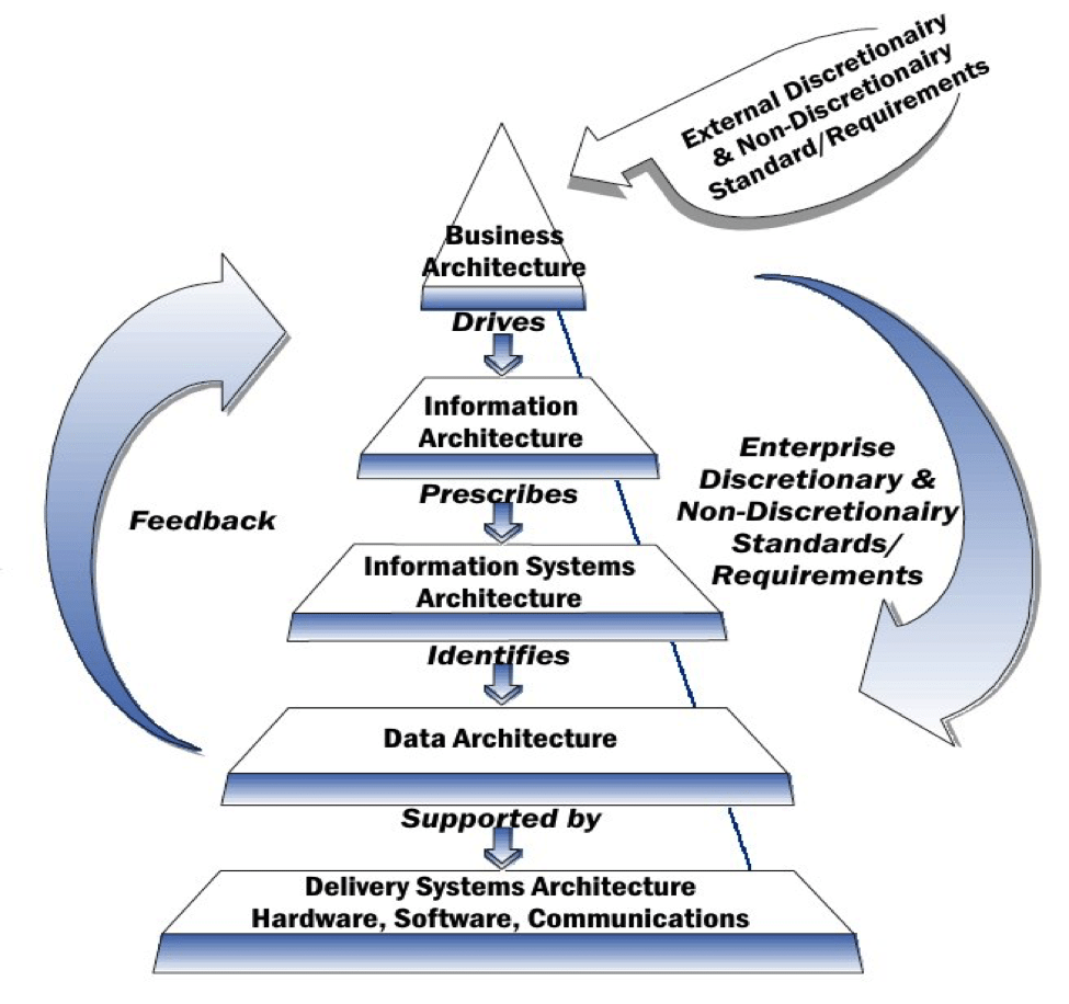 EA Framework: An EA framework defines how to create and employ enterprise architecture. It provides practices and principles for building and employing an architectural description of the system. The architecture description is divided into domains, views, and layers. In addition, EA offers models—generally diagrams and matrices for documenting each domain. EA models help in making long-term decisions regarding new design requirements, support, and sustainability as well as making systematic design decisions on all components of the system. The following diagram shows the NIST Enterprise Architecture Model. It consists of five layers of enterprise architecture, including Business Architecture, Information Architecture, Information Systems Architecture, Data Architecture, and Delivery Systems Architecture (Hardware, Software, and Communications).