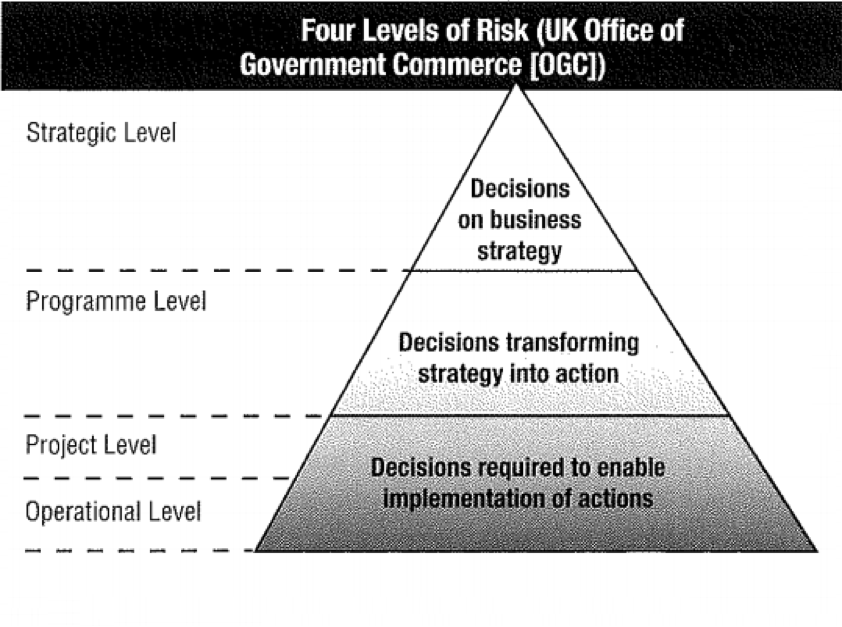 The UK Office of Government Commerce (OGC) defines four levels of risks that help businesses to consider IT risks. These four levels are strategic, program, project, and operational. Their brief description and pyramid visualization are given below.