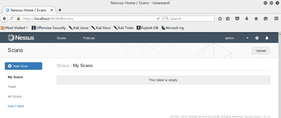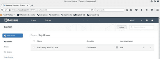 To perform a vulnerability scan, you would need to navigate your browser to the link https://localhost:8834. See below: