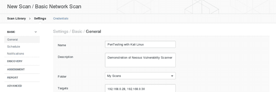 Basic: With this setting, you can specify security-related and organizational aspects of the scan or policy. These aspects will include the name of the scan, the targets of the scan, whether or not it is scheduled and who has access to it. Locate the sections available within the basic settings here.