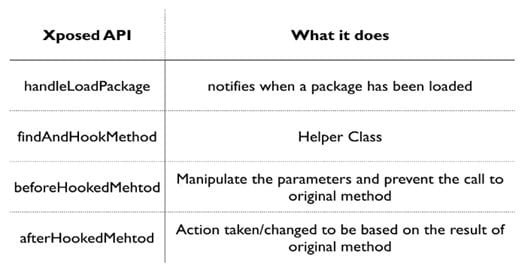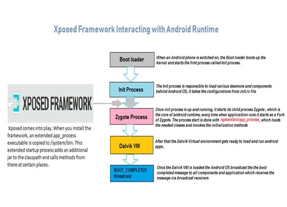 As can also be seen in the above diagram, the Xposed framework is initiated in between the Init process and the Zygote process. Further, this has been specifically written by an XDA member known as "rovo89". Also, the Xposed framework has various API calls that interact with the Android runtime functionalities. These APIs are illustrated in the diagram below: