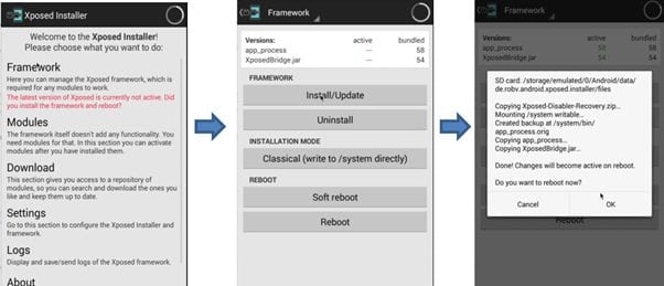 The following sequence of steps permits the installation of an Xposed Framework Module: